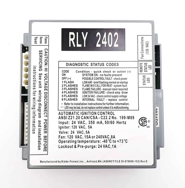 • Electrical Specifications: Input: 24 VAC, 350 mA, 50/60Hz, Igniter: 120 VAC, 5A, Valve: 24 VAC, 5A, Fan: 120 VAC, 15A or 240VAC, 8A, Operating Temperature: -40°C to +73°C, Lockout & Pre-purge: 24 VAC, 1A